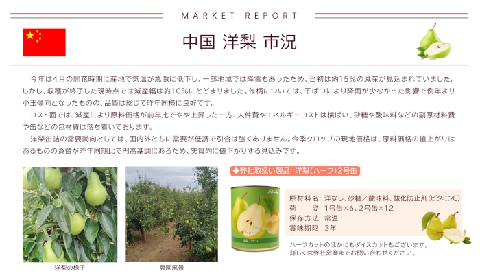 洋梨缶詰の需要動向としては、国内外ともに需要が低調で引合は強くありません。今季クロップの現地価格は、原料価格の値上がりはあるものの為替が昨年同期比で円高基調にあるため、実質的に値下がりする見込みです。