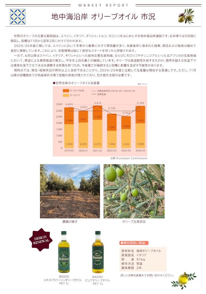 2025/26年産に関しては、スペインにおいて冬季から春季にかけて降雨量が多く、気象条件に恵まれた結果、開花および結実は極めて良好に推移しています。これにより、生産環境は総じて良好なスタートを切ったと評価されます。