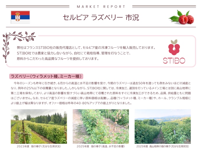 今年のシーズンも昨年に引き続き、6月からの高温と水不足の影響を受け、今期のラズベリーは過去50年を遡っても例をみないほどの減産となり、例年の25%以下の収穫量となりました。しかしながら、STIBO社に関しては、冷凍加工、選別を行っているメイン工場とは別に高山地帯に第二工場を保有しており、より高温の影響を受けづらい高山地帯にて収穫された原料をすぐに冷凍加工ができるため、品質、供給量ともに問題はございません。なお、セルビア産ラズベリーの減産に伴い原料価格は高騰し、品種(ウィラメット種、ミーカー種)や、ホール、クランブル規格により値上げ幅は異なりますが、オファー価格は昨年の40-80%アップでの値上がりとなりました。