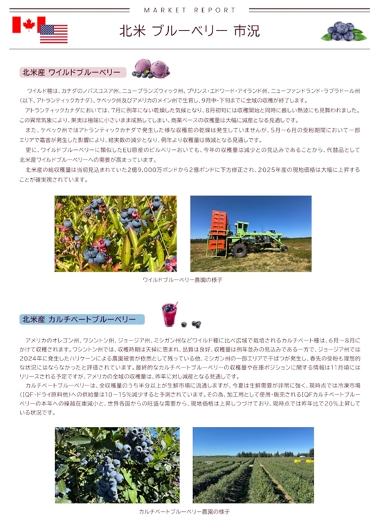 更に、ワイルドブルーベリーに類似したEU原産のビルベリーおいても、今年の収穫量は減少との見込みであることから、代替品として北米産ワイルドブルーベリーへの需要が高まっています。
