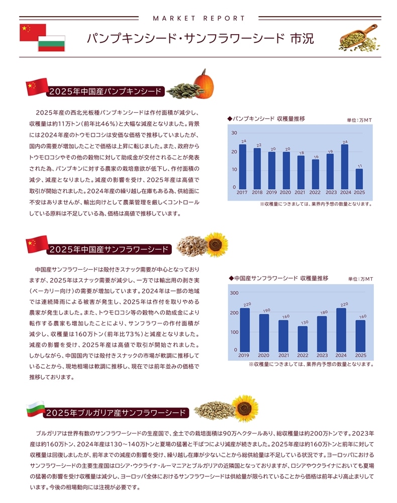 中国産サンフラワーシードは殻付きスナック需要が中心となっておりますが、2025年はスナック需要が減少し、一方では輸出用の剥き実(ベーカリー向け)の需要が増加しています。2024年は一部の地域では連続降雨による被害が発生し、2025年は作付を取りやめる農家が発生しました。また、トウモロコシ等の穀物への助成金により転作する農家も増加したことにより、サンフラワーの作付面積が減少し、収穫量は160万トン(前年比73%)と減産となりました。減産の影響を受け、2025年産は高値で取引が開始されました。しかしながら、中国国内では殻付きスナックの市場が軟調に推移していることから、現地相場は軟調に推移し、現在では前年並みの価格で推移しております。