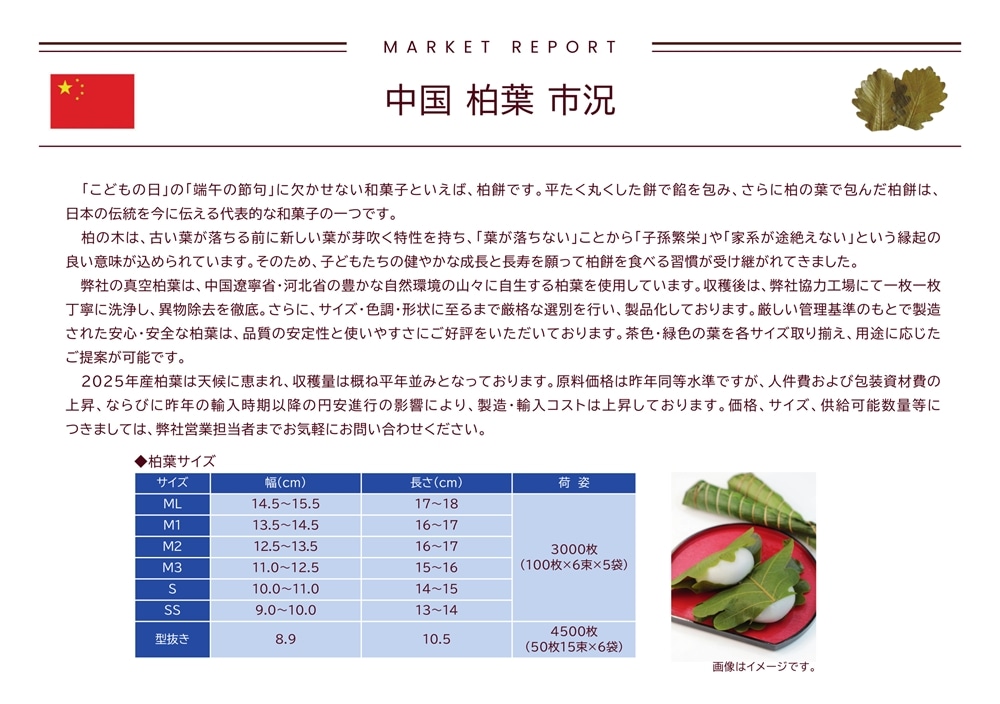 2025年産柏葉は天候に恵まれ、収穫量は概ね平年並みとなっております。原料価格は昨年同等水準ですが、人件費および包装資材費の上昇、ならびに昨年の輸入時期以降の円安進行の影響により、製造・輸入コストは上昇しております。価格、サイズ、供給可能数量等につきましては、弊社営業担当者までお気軽にお問い合わせください。