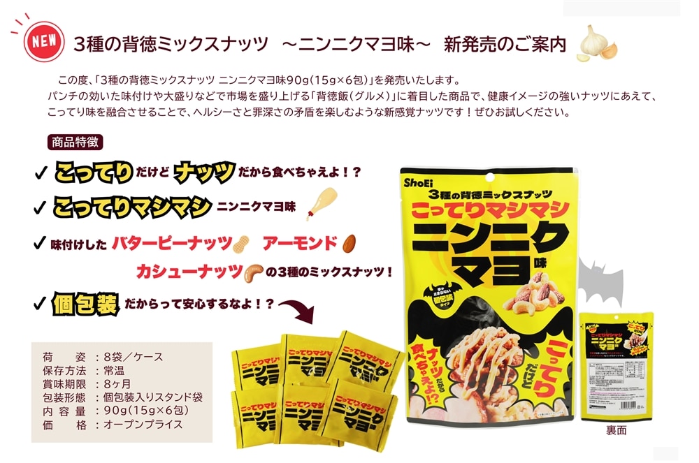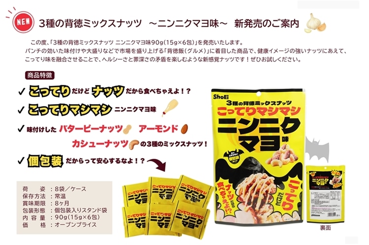 この度、「3種の背徳ミックスナッツ ニンニクマヨ味90g(15g×6包)」を発売いたします。