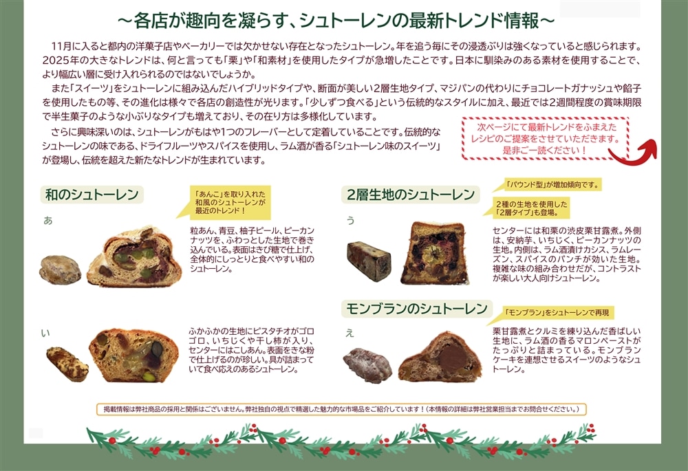 11月に入ると都内の洋菓子店やベーカリーでは欠かせない存在となったシュトーレン。年を追う毎にその浸透ぶりは強くなっていると感じられます。2025年の大きなトレンドは、何と言っても「栗」や「和素材」を使用したタイプが急増したことです。日本に馴染みのある素材を使用することで、より幅広い層に受け入れられるのではないでしょうか。