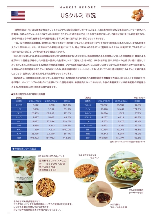特に、殻付に関しては、昨年は米国産が減産に伴う高値相場であったことから、価格優位性のある中国産へシフトした中東諸国が、豊作による値下がりで価格差が縮小した米国産へ回帰した影響で、トルコ(前年比319.0%)、UAE(前年比254.5%)への出荷が大幅に増加しております。また、剥実における12月末の累計出荷量は、アメリカ農務省(USDA)による買い上げプログラムが実施されなかった影響で、米国内への出荷が前年比92.3%と落ち込むものの、高値相場を避けショートカバーであったドイツへの出荷が前年比174.9%と大幅に伸長したことで、全体として前年比103.5%と微増となっております。
