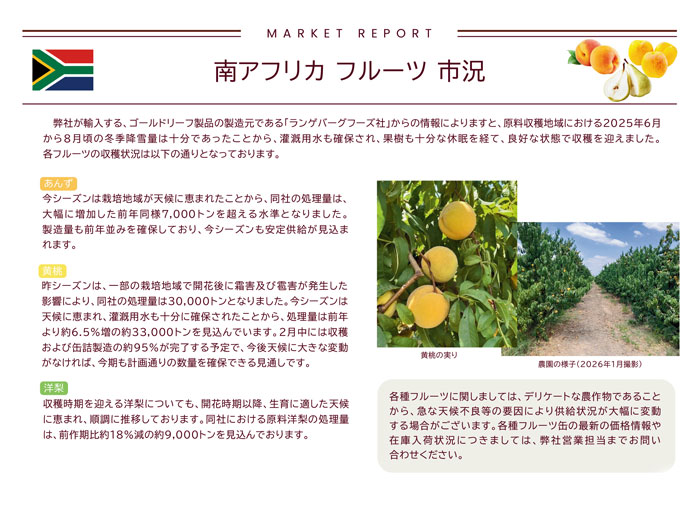 弊社が輸入する、ゴールドリーフ製品の製造元である「ランゲバーグフーズ社」からの情報によりますと、原料収穫地域における2025年6月から8月頃の冬季降雪量は十分であったことから、灌漑用水も確保され、果樹も十分な休眠を経て、良好な状態で収穫を迎えました。各フルーツの収穫状況は以下の通りとなっております。