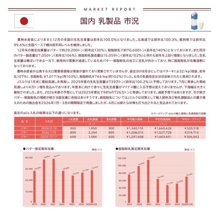 Jミルクは1月末に需給見通しを発表し、2025年度の生乳生産量は739万トン(前年比100.2%)と予想しております。7月に発表した需給見通しより4万トン増を見込んでおります。年度末に向けて徐々に生乳生産量がマイナス圏に入る予想は変えておりませんが、下落幅は大きく緩和されました。また、2026年度の予想としては2025年度比で98%の726万トンと発表しております。減産予想ではありますが、引き続きバター・脱脂粉乳の増産が続き当面在庫に余裕はありそうです。脱脂粉乳についてはJミルクは対策として輸入飼料及び粉乳調製品との置き換えのための拠出金を2026年1月~3月の期間限定で用意しましたが、4月には新たな対策も打ち出されると見込まれております。