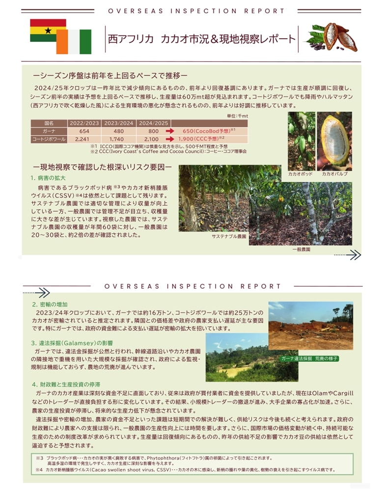 違法採掘や密輸の増加、農家の資金不足といった課題は短期間での解決が難しく、供給リスクは今後も続くと考えられます。政府の財政難により農家への支援は限られ、一般農園の生産性向上には時間を要します。さらに、国際市場の価格変動が続く中、持続可能な生産のための制度改革が求められています。生産量は回復傾向にあるものの、昨年の供給不足の影響でカカオ豆の供給は依然として逼迫すると予想されます。