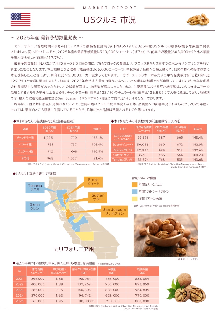 カリフォルニア現地時間の9月4日に、アメリカ農務省統計局(以下NASS)より2025年産USクルミの最終収穫予想数量が発表されました。同レポートによると、2025年産の最終予想数量は710,000ショートトン(以下st)で、前年の収穫量(603,000st)と比べ増産予想となりました(前年比117.7%)。