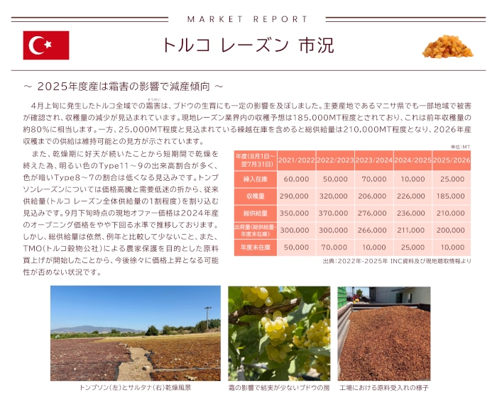 4月上旬に発生したトルコ全域での霜害は、ブドウの生育にも一定の影響を及ぼしました。主要産地であるマニサ県でも一部地域で被害が確認され、収穫量の減少が見込まれています。現地レーズン業界内の収穫予想は185,000MT程度とされており、これは前年収穫量の約80%に相当します。一方、25,000MT程度と見込まれている繰越在庫を含めると総供給量は210,000MT程度となり、2026年産 収穫までの供給は維持可能との見方が示されています。