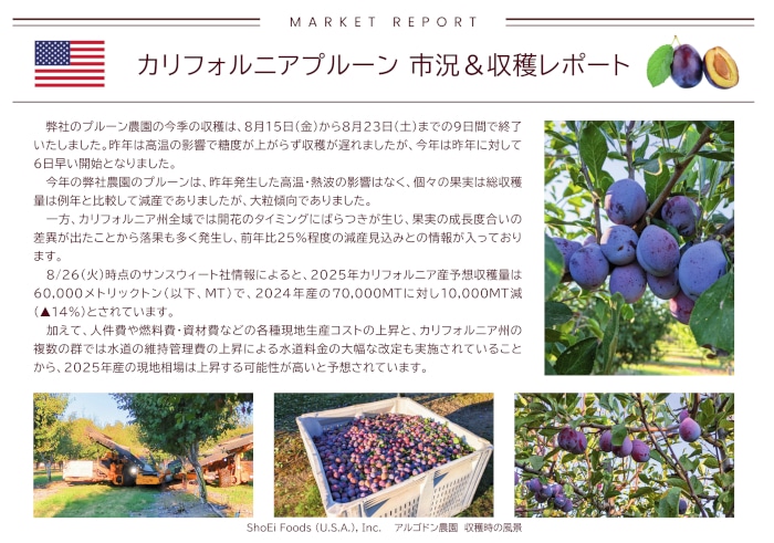 8/26(火)時点のサンスウィート社情報によると、2025年カリフォルニア産予想収穫量は60,000メトリックトン(以下、MT)で、2024年産の70,000MTに対し10,000MT減(▲14%)とされています。