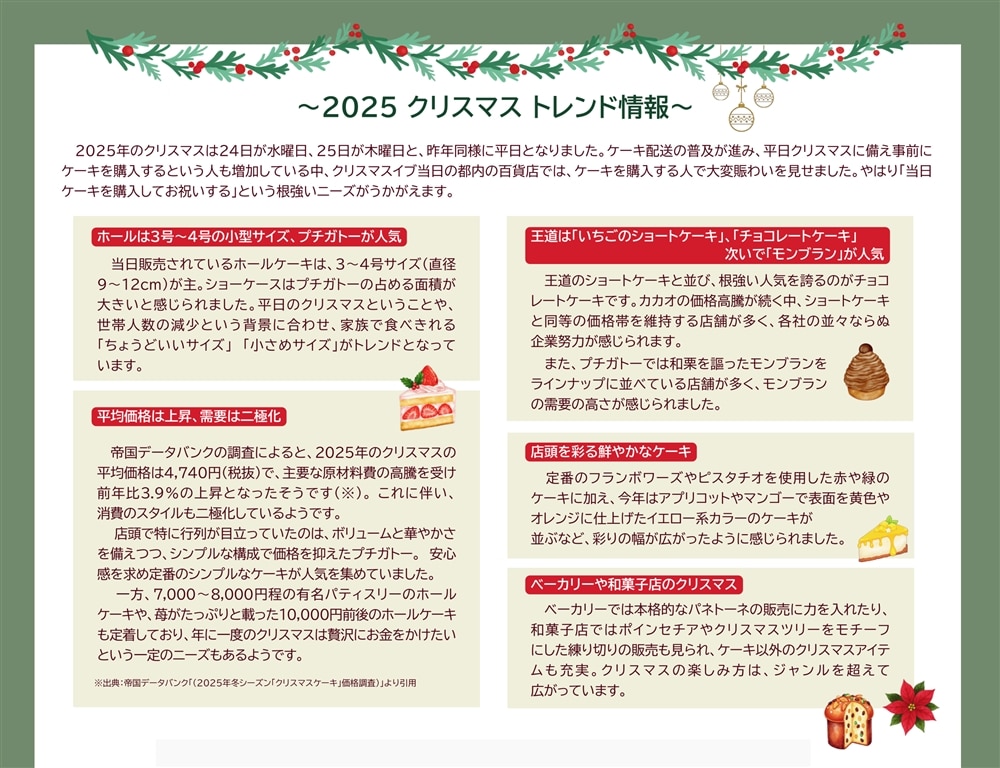2025年のクリスマスは24日が水曜日、25日が木曜日と、昨年同様に平日となりました。ケーキ配送の普及が進み、平日クリスマスに備え事前にケーキを購入するという人も増加している中、クリスマスイブ当日の都内の百貨店では、ケーキを購入する人で大変賑わいを見せました。やはり「当日ケーキを購入してお祝いする」という根強いニーズがうかがえます。