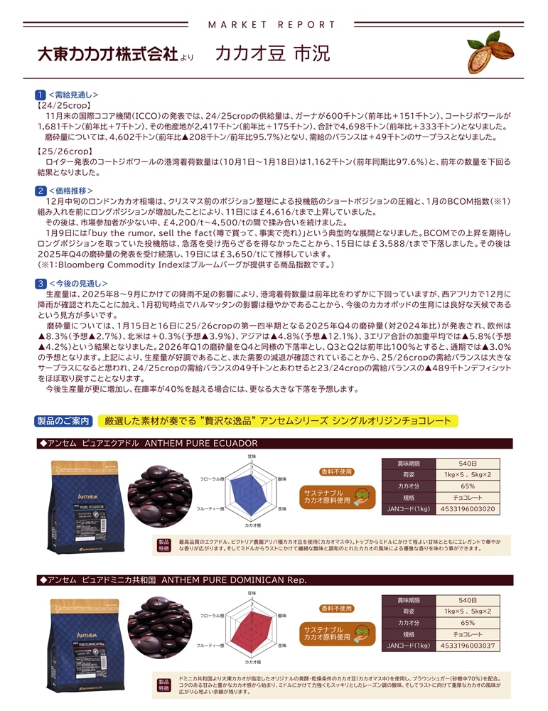 生産量は、2025年8~9月にかけての降雨不足の影響により、港湾着荷数量は前年比をわずかに下回っていますが、西アフリカで12月に降雨が確認されたことに加え、1月初旬時点でハルマッタンの影響は穏やかであることから、今後のカカオポッドの生育には良好な天候であるという見方が多いです。
