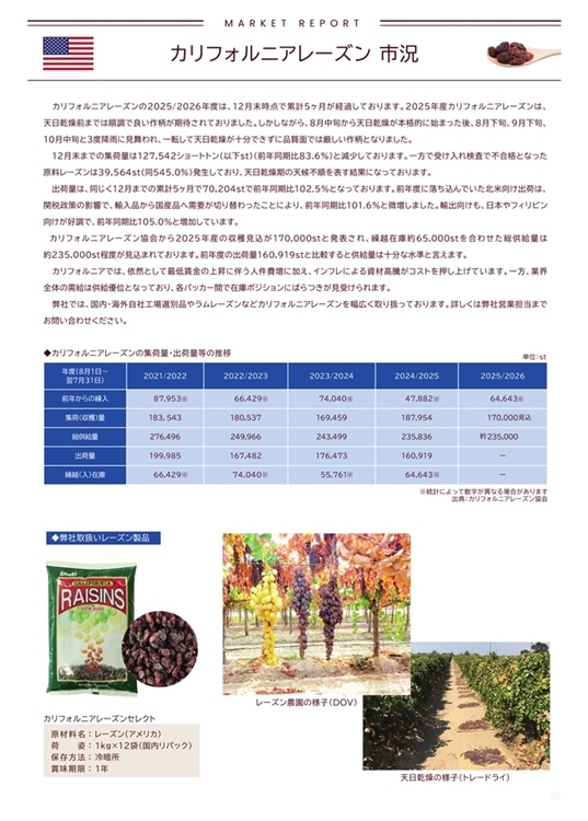 カリフォルニアレーズン協会から2025年産の収穫見込が170,000stと発表され、繰越在庫約65,000stを合わせた総供給量は約235,000st程度が見込まれております。前年度の出荷量160,919stと比較すると供給量は十分な水準と言えます。