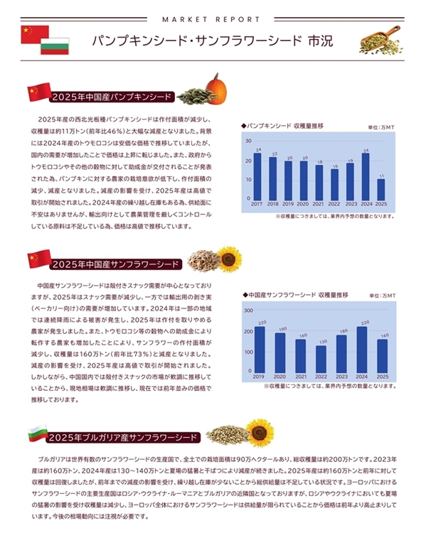 中国産サンフラワーシードは殻付きスナック需要が中心となっておりますが、2025年はスナック需要が減少し、一方では輸出用の剥き実(ベーカリー向け)の需要が増加しています。2024年は一部の地域では連続降雨による被害が発生し、2025年は作付を取りやめる農家が発生しました。また、トウモロコシ等の穀物への助成金により転作する農家も増加したことにより、サンフラワーの作付面積が減少し、収穫量は160万トン(前年比73%)と減産となりました。減産の影響を受け、2025年産は高値で取引が開始されました。しかしながら、中国国内では殻付きスナックの市場が軟調に推移していることから、現地相場は軟調に推移し、現在では前年並みの価格で推移しております。