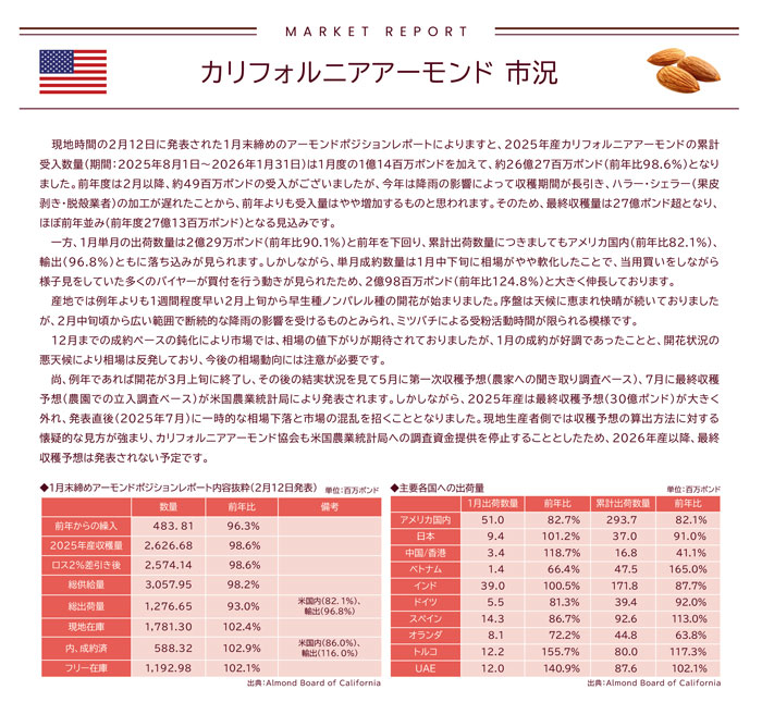 現地時間の2月12日に発表された1月末締めのアーモンドポジションレポートによりますと、2025年産カリフォルニアアーモンドの累計受入数量(期間:2025年8月1日~2026年1月31日)は1月度の1億14百万ポンドを加えて、約26億27百万ポンド(前年比98.6%)となりました。前年度は2月以降、約49百万ポンドの受入がございましたが、今年は降雨の影響によって収穫期間が長引き、ハラー・シェラー(果皮 剥き・脱殻業者)の加工が遅れたことから、前年よりも受入量はやや増加するものと思われます。そのため、最終収穫量は27億ポンド超となり、ほぼ前年並み(前年度27億13百万ポンド)となる見込みです。