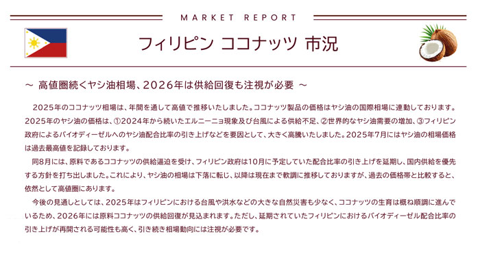 今後の見通しとしては、2025年はフィリピンにおける台風や洪水などの大きな自然災害も少なく、ココナッツの生育は概ね順調に進んでいるため、2026年には原料ココナッツの供給回復が見込まれます。ただし、延期されていたフィリピンにおけるバイオディーゼル配合比率の引き上げが再開される可能性も高く、引き続き相場動向には注視が必要です。
