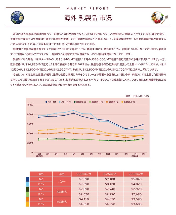 Jミルクは1月末に需給見通しを発表し、2025年度の生乳生産量は739万トン(前年比100.2%)と予想しております。7月に発表した需給見通しより4万トン増を見込んでおります。年度末に向けて徐々に生乳生産量がマイナス圏に入る予想は変えておりませんが、下落幅は大きく緩和されました。また、2026年度の予想としては2025年度比で98%の726万トンと発表しております。減産予想ではありますが、引き続きバター・脱脂粉乳の増産が続き当面在庫に余裕はありそうです。脱脂粉乳についてはJミルクは対策として輸入飼料及び粉乳調製品との置き換えのための拠出金を2026年1月~3月の期間限定で用意しましたが、4月には新たな対策も打ち出されると見込まれております。