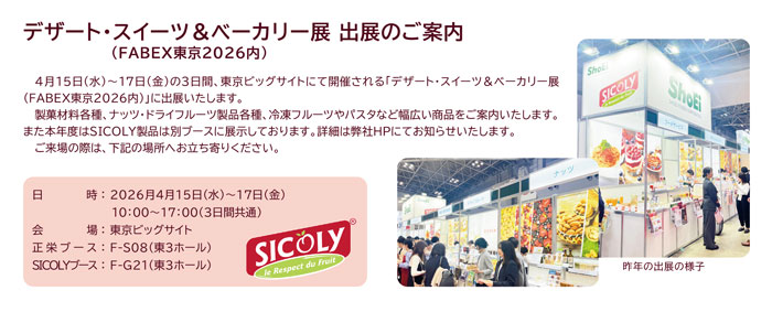 製菓材料各種、ナッツ・ドライフルーツ製品各種、冷凍フルーツやパスタなど幅広い商品をご案内いたします。 また本年度はSICOLY製品は別ブースに展示しております。詳細は弊社HPにてお知らせいたします。